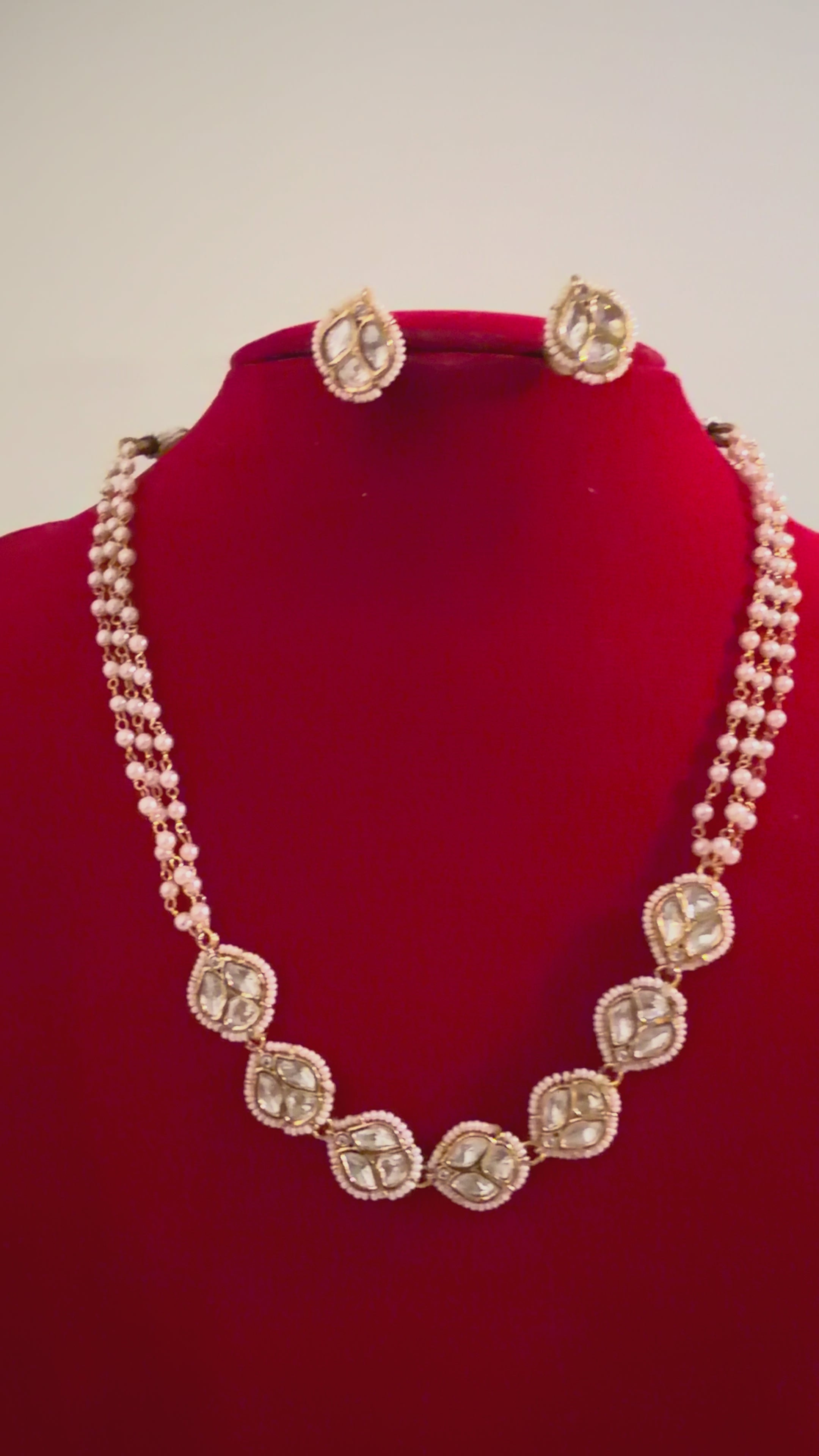 Redefine sophistication with this meticulously designed masterpiece that effortlessly combines artistry and glamour. This captivating set seamlessly blends opulence and craftsmanship, featuring radiant Kundan stones meticulously handcrafted and beaded with white pearls into a stunning necklace and matching earrings.Embrace your inner royalty with Anokhi's regal Kundan creations. Each piece is a symbol of timeless splendor, designed to adorn you with majestic allure. Elevate your style and reign with grace wherever you go. #RegalElegance #MajesticAdornments #AnokhiRoyalty